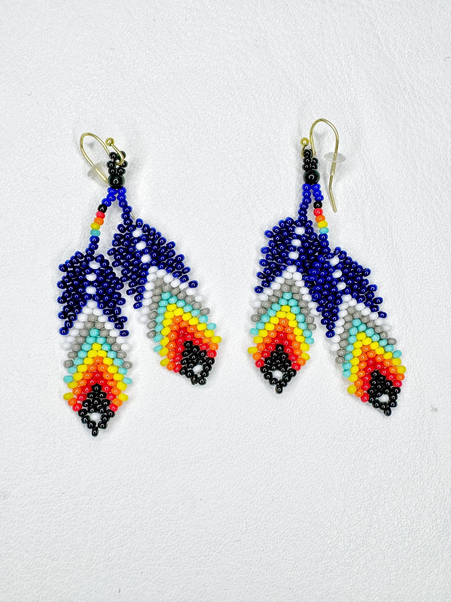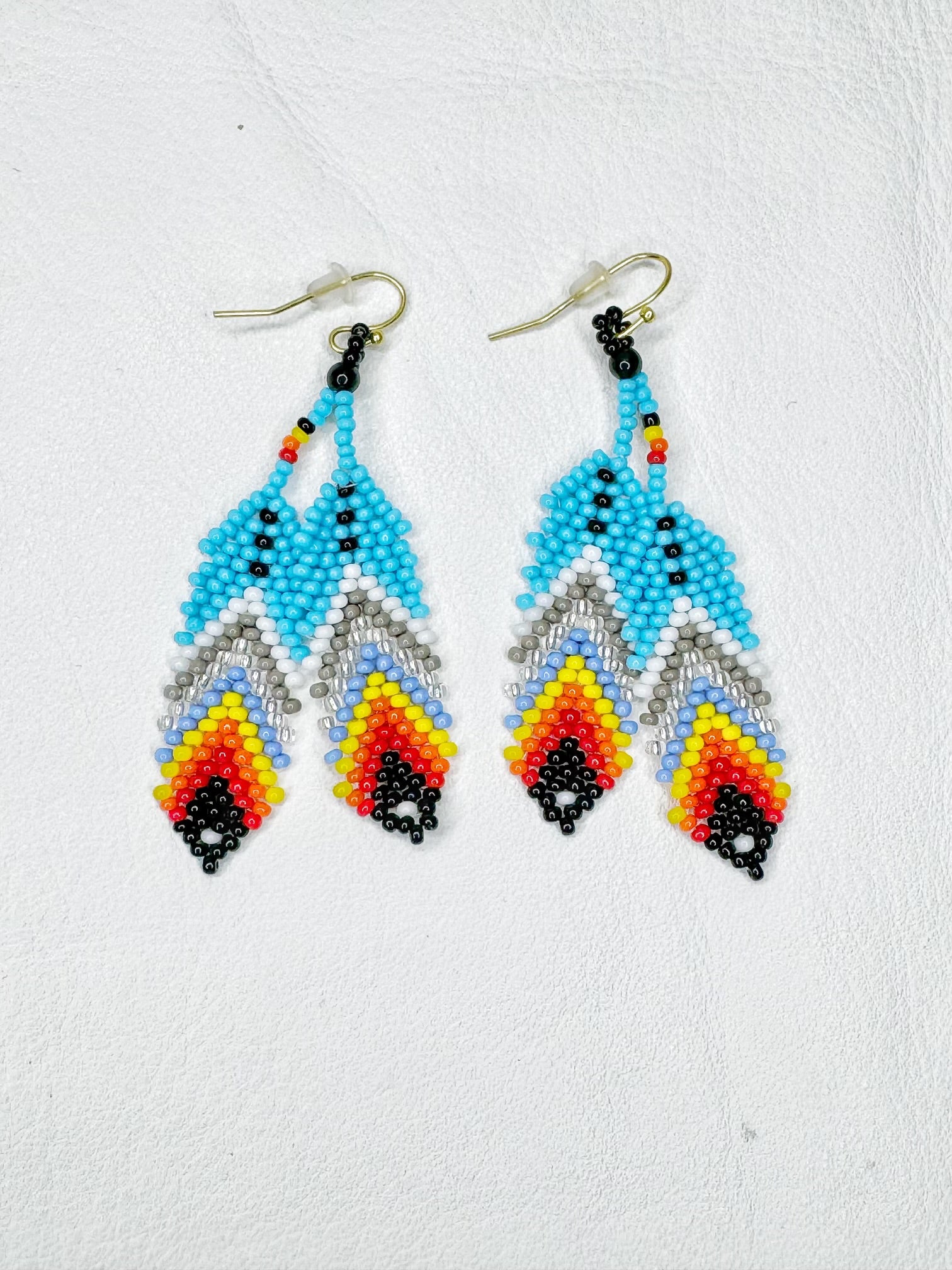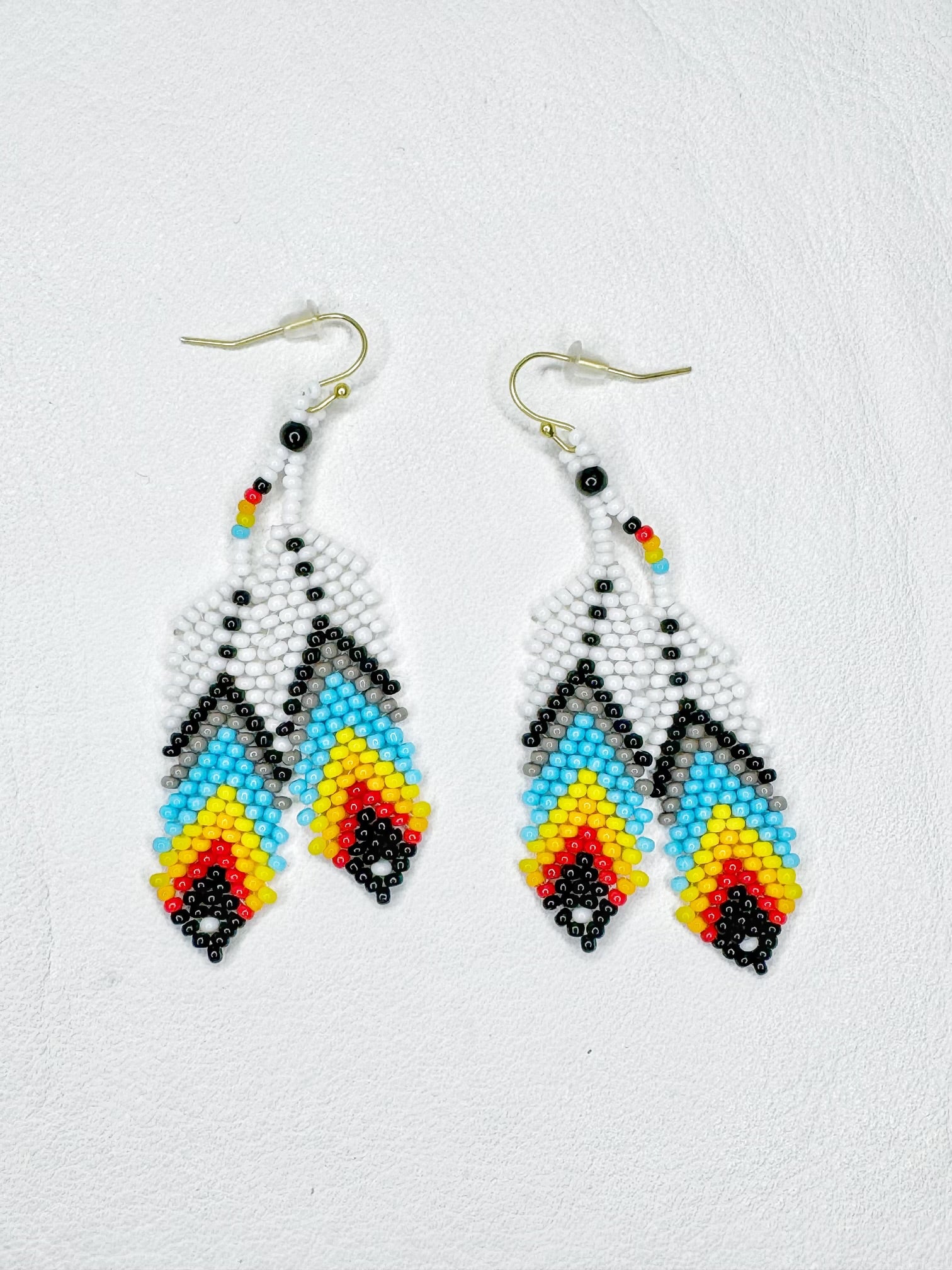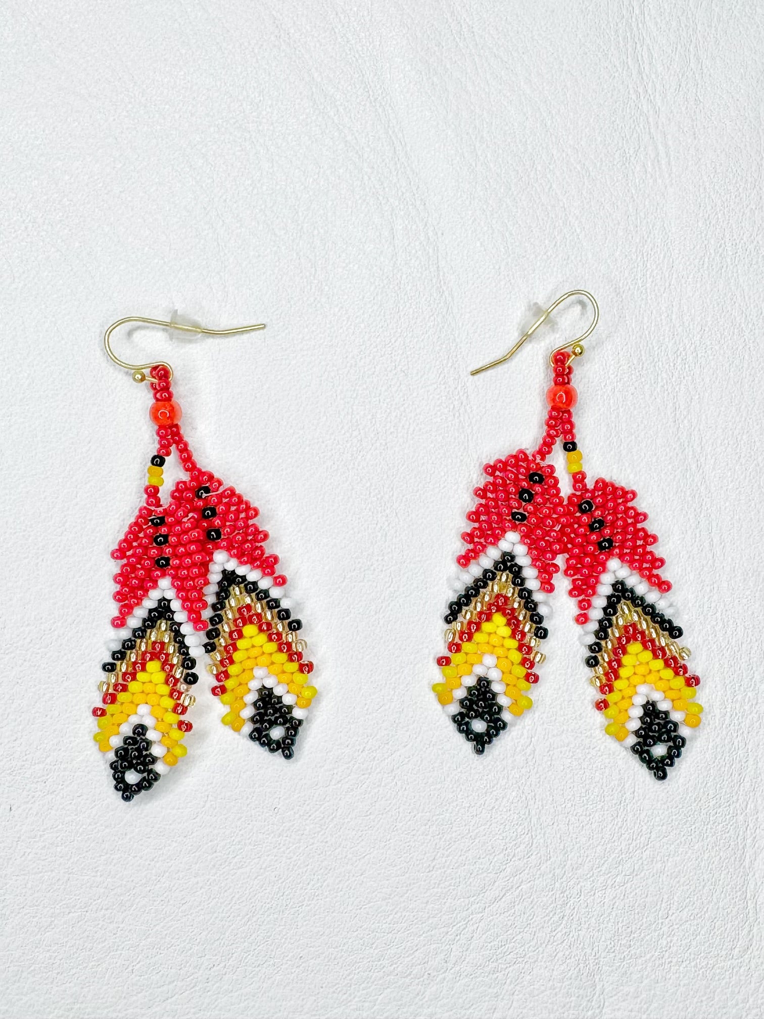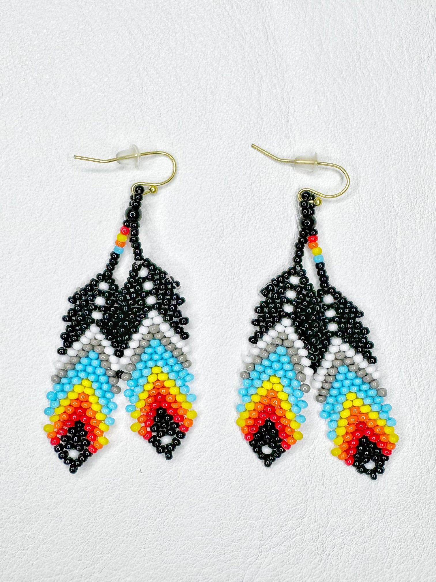 Introducing our captivating Beaded Double Feather Earrings, featuring a native-inspired design with twin feather motifs in assorted colors. Each earring measures approximately 6cm (2.4 inches) in length, exuding elegance and cultural significance. With limited stock available, seize the chance to adorn yourself with these unique pieces. Plus, enjoy the comfort of hypoallergenic hooks. Elevate your style with these crafted treasures that seamlessly blend tradition and contemporary flair.
