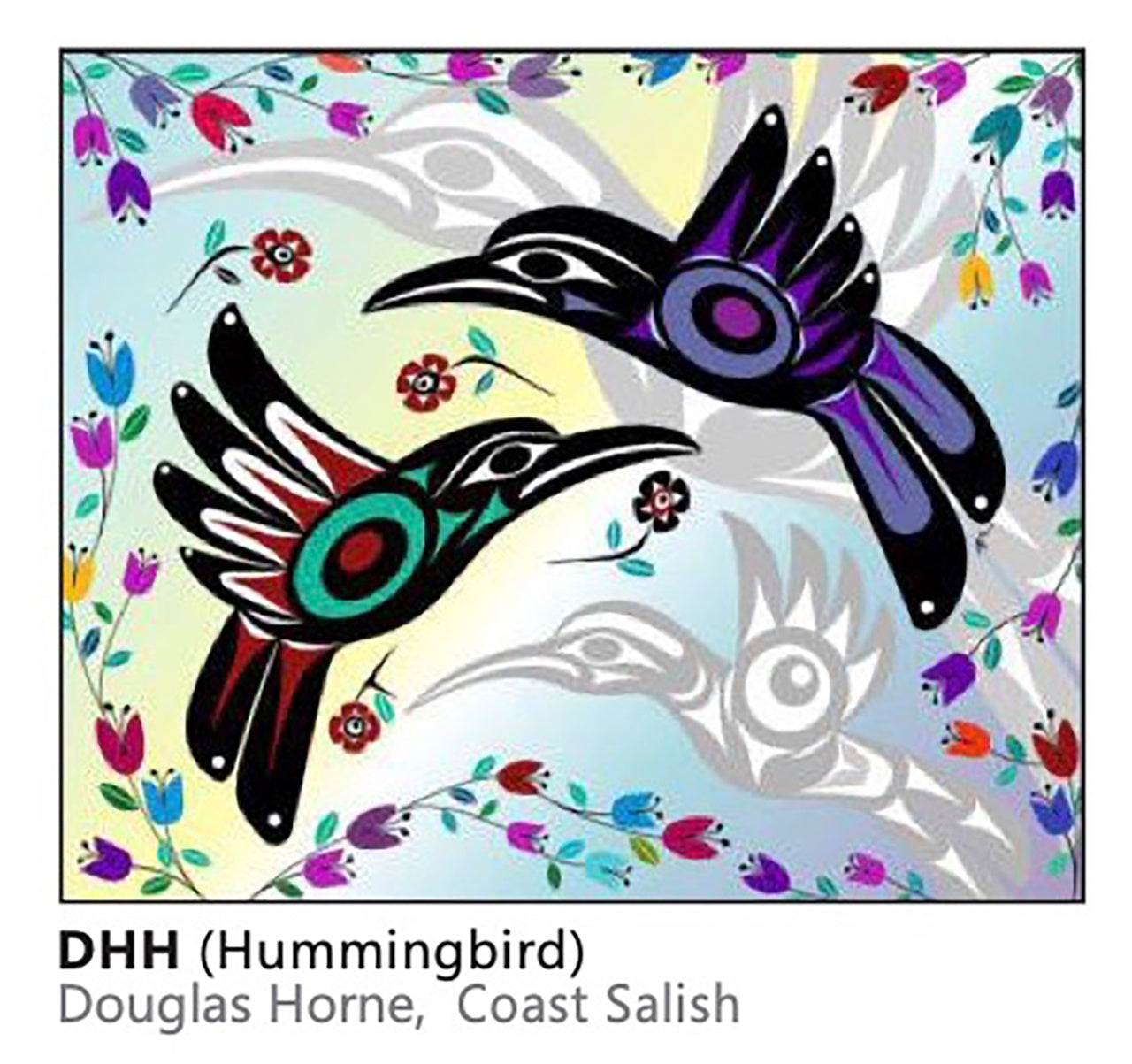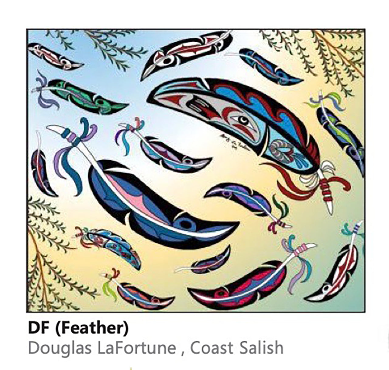 Douglas LaFortune’s Feather artwork celebrates honor, strength, and tradition. With bold Coast Salish styling, the feathers float gracefully across the design, symbolizing connection, spirituality, and cultural pride.