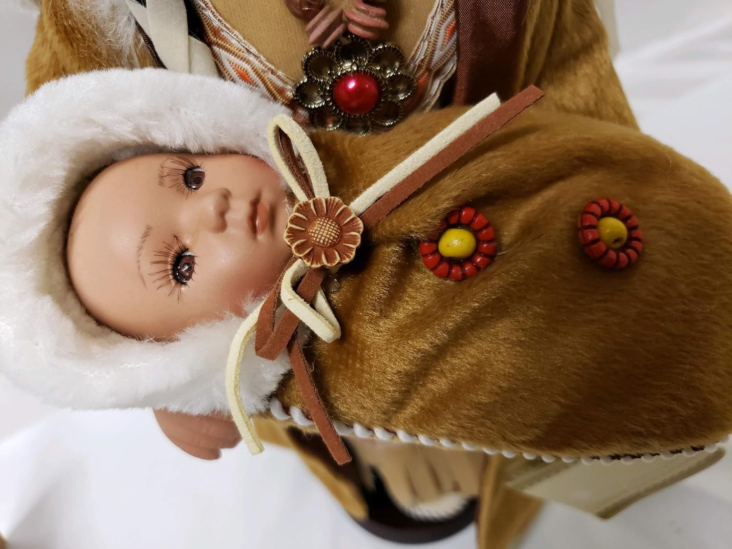 Aditi stands at 16 inches tall and is a prized collectible Native American Porcelain Doll. She comes complete with a doll stand for display. Adorned with a beautifully detailed Native American outfit, her porcelain head, hands, and feet accentuate her stunning face embellished with decorative accessories. Aditi is not intended as a toy but rather as a piece for collection and decoration. Crafted primarily from porcelain and polyester, she comes with a Certificate of Authenticity for assurance.
